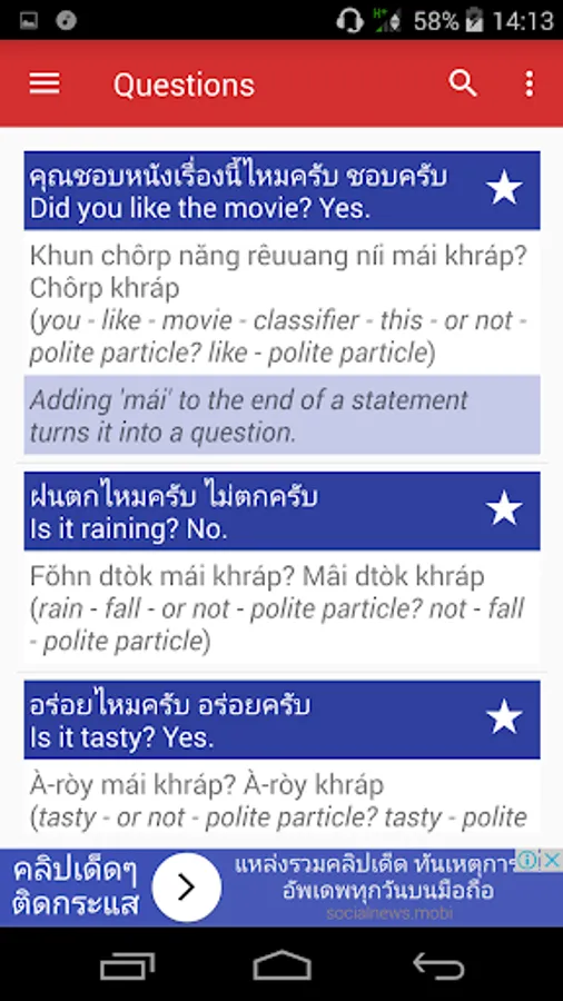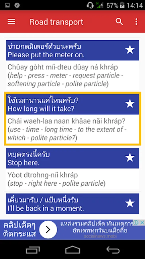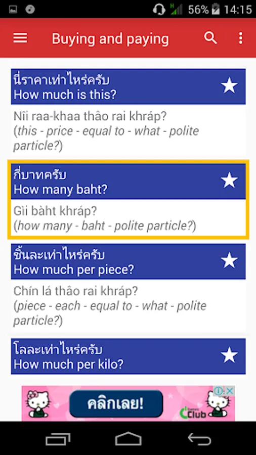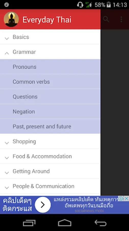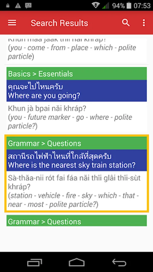 Learn useful everyday Thai words and phrases covering a wide range of topics such as food, accommodation and weather. Choose from male or female voice. Learn the basics of Thai grammar. Practice the different tones. Includes word by word translation to help you understand what you are saying. This app uses Central Thai which is the official language of Thailand. It is understood throughout the country although there are differences in regional dialects.