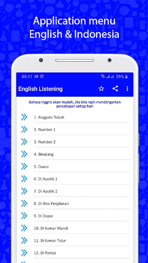 Listening is the most important skill in English. This software will help you to practice English & Indonesian listening easier. The sound of the conversation is quite slow.
