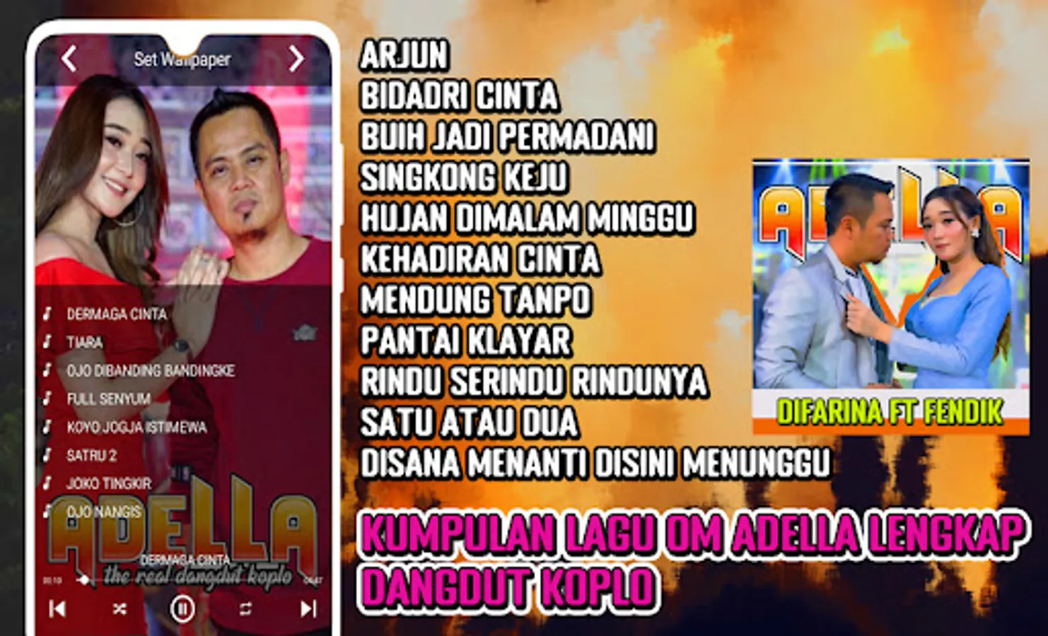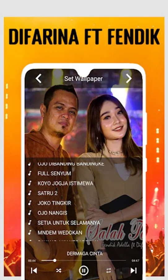 Adella Difarina Ft Fendik Hits is an application that is suitable for you to use for connoisseurs of mp3 dangdut koplo 2022 because in it you will get a collection of om adella 2022 full album songs that you can play all day because the song om adella is offline blue dock so you will no longer be afraid out of quota. This application is perfect for you listeners of mp3 om adella complete offline and we present the latest koplo koplo om adella dangdut song that will entertain all of you. Now you can feel all the conveniences of singing with Yeni Inka Om Adella here. With the most complete Om Adella song, you can invite your friends to listen to the best Om Adella duet song. We come with various features and also a very good sound, guaranteed you can enjoy every song om adella tiara offline ojo compared to difarina indra duet fendik oflfine.