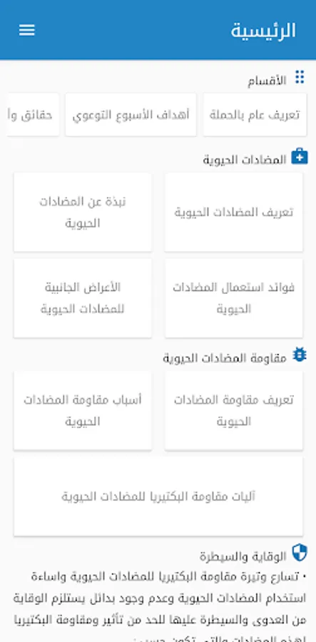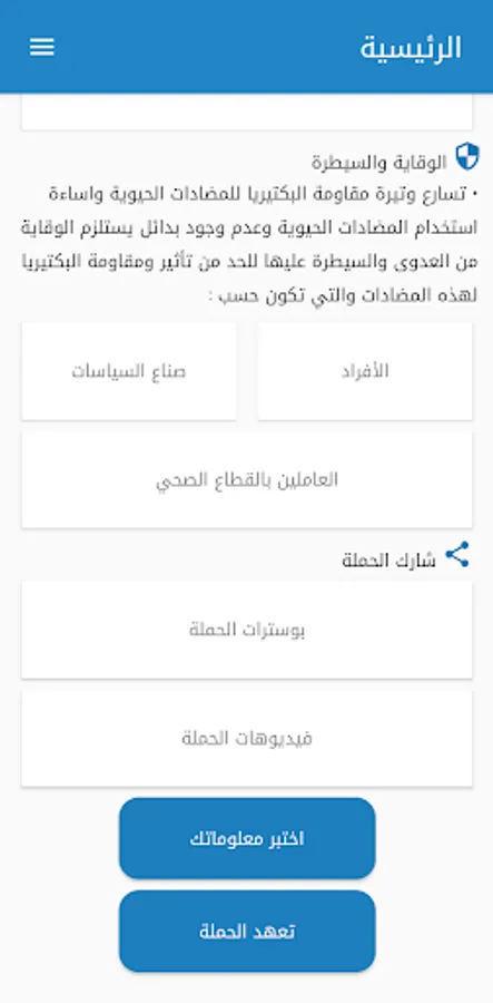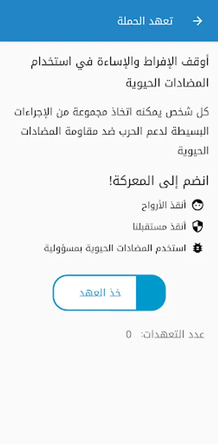 The implementation of the World Antibiotic Awareness Week Campaign aims to inform the user of antibiotics, their uses, benefits and manifestations of misuse and the consequences that may result. The application included an easy test for the public for the purpose of awareness in addition to the possibility of the user pledge not to take antibiotics only by prescription in addition to guidance tips, information on how the emergence of antibiotic resistance to bacteria and global measures to reduce this dangerous phenomenon