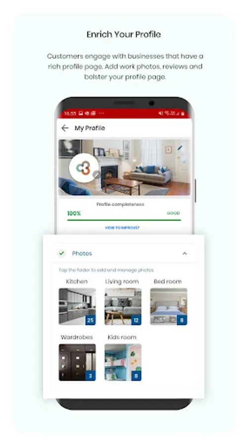 • Build your profile 100% to act as your Sales Intro - upload photos, map location, services offered and more. This gives customers more confidence & you get more credibility.