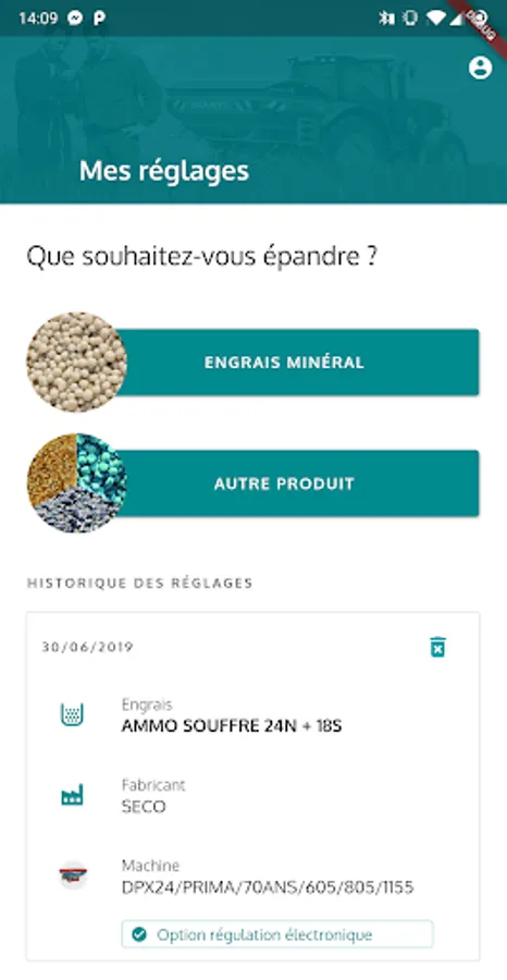It is an assistance tool for the correct adjustment of the SULKY fertiliser spreader. The "FERTITEST" application is available 24 hours a day and can be accessed without being connected to the internet. The app is accessible after creating an account in order to provide a personalised service and allow the user to memorise his settings. The user can make a feedback in order to better take into account the conditions of use of the machine.