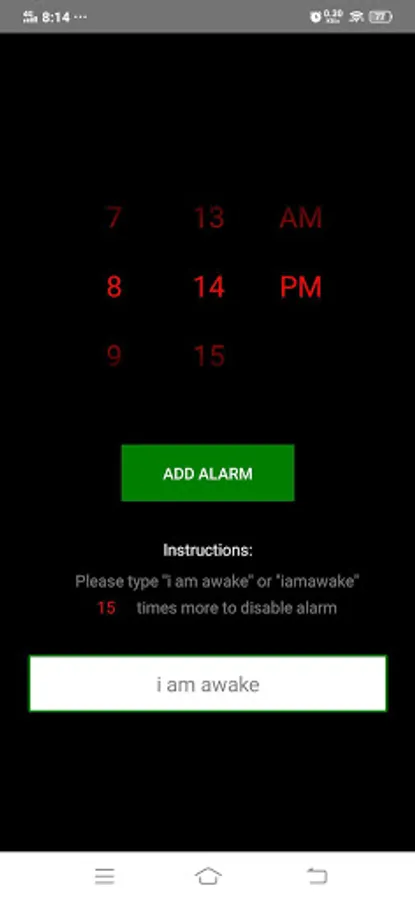 The app is designed to only be switched off by you typing 15 times that you are awake, otherwise the alarm will carry on until the end of time.