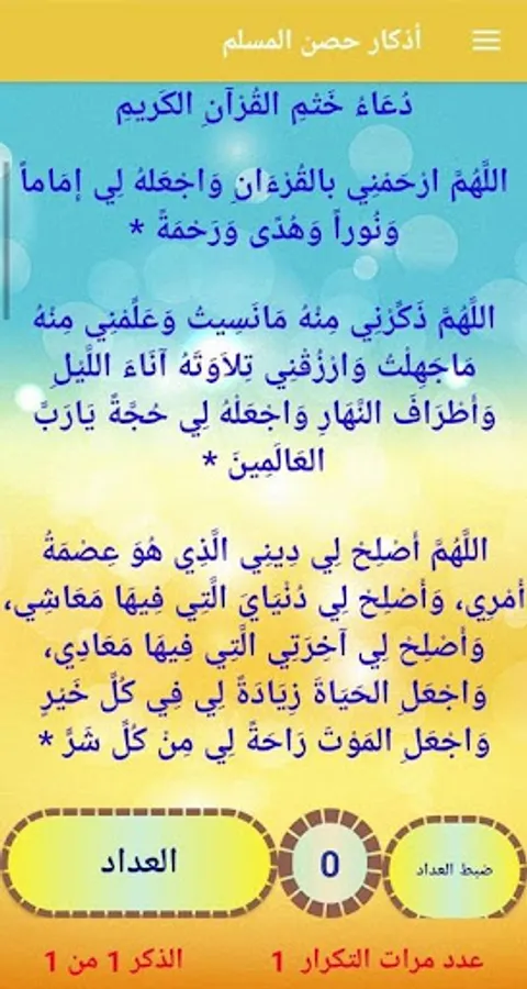 Among these dhikr: morning and evening dhikr, prayer dhikr and praises, the dhikr of the mosque, dhikr sleep, the legal paper of the Qur’an and the Sunnah, the supplications of the supplication, the supplications of the Prophet, may God bless him and grant him peace, separate dhikr, the supplication of the seal of the Holy Qur’an and many other supplications ....