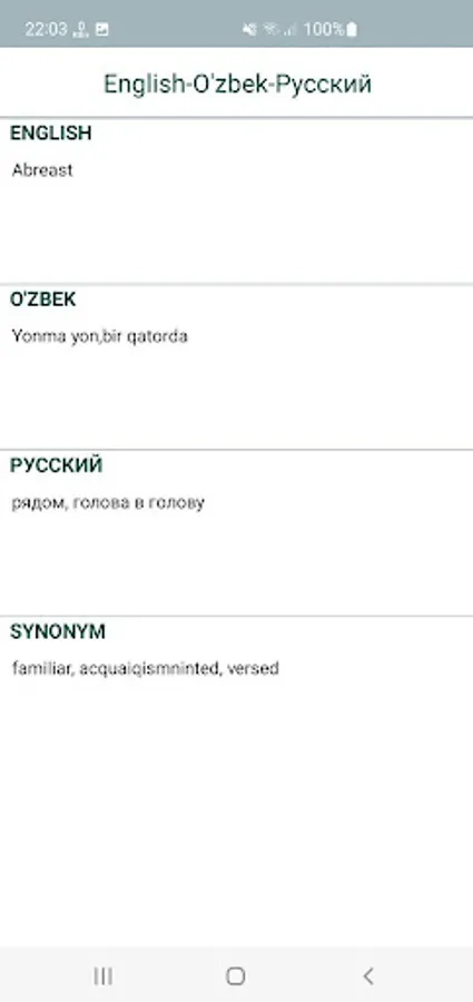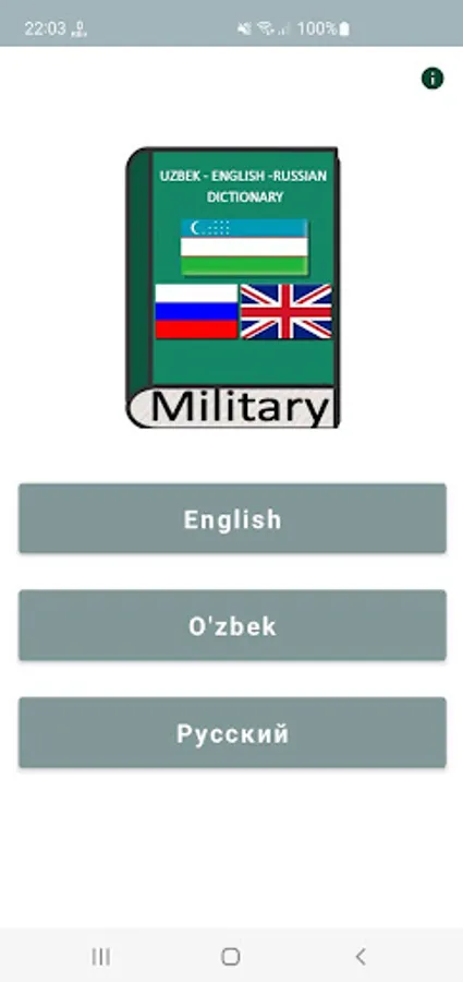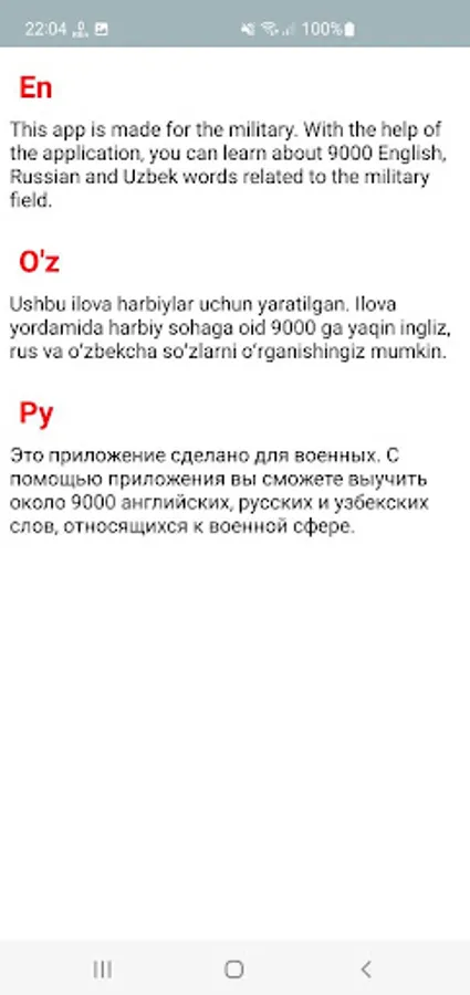 This app is made for the military. With the help of the application, you can learn about 9000 English, Russian and Uzbek words related to the military field