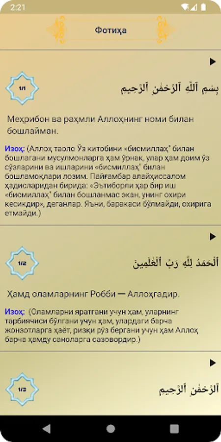 This application is a translation of the Holy Qur'an in the Uzbek language. App is created by Android Developer Sulton UzDev.