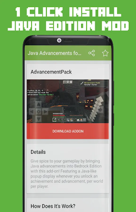 Java Advancements Mod for Minecraft PE is an application that allowed you to easily download & install Java AdvancementPack Add-on to Minecraft Pocket Edition game in your Android devices. Thanks to our 1-Click installer that make it super easy to install Minecraft Mods, Addons, Maps, Skins, and Texture Packs.