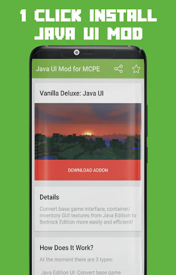 Java UI Mod for Minecraft PE is an application that allowed you to easily download & install Vanilla Deluxe: Java UI + Mixed UI + PvP UI Add-on to Minecraft Pocket Edition game in your Android devices. Thanks to our 1-Click installer that make it super easy to install Minecraft Mods, Addons, Maps, Skins, and Texture Packs.