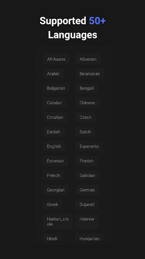 Afrikaans, Albanian, Amharic, Arabic, Armenian, Azerbaijani, Basque, Belarusian, Bengali, Bosnian, Bulgarian, Catalan, Cebuano, Chichewa, Chinese Simplified, Chinese Traditional, Corsican, Croatian, Czech, Danish, Dutch, English, Esperanto, Estonian, Filipino, Finnish, French, Frisian, Galician, Georgian, German, Greek, Gujarati, Haitian Creole, Hausa, Hawaiian, Hebrew, Hindi, Hmong, Hungarian, Icelandic, Igbo, Indonesian, Irish, Italian, Japanese, Javanese, Kannada, Kazakh, Khmer, Korean, Kurdish, Kyrgyz, Lao, Latin, Latvian, Lithuanian, Luxembourgish, Macedonian, Malagasy, Malay, Malayalam, Maltese, Maori, Marathi, Mongolian, Myanmar, Nepali, Norwegian, Pashto, Persian, Polish, Portuguese, Punjabi, Romanian, Russian, Samoan, Scots Gaelic, Serbian, Sesotho, Shona, Sindhi, Sinhala, Slovak, Slovenian, Somali, Spanish, Sundanese, Swahili, Swedish, Tajik, Tamil, Telugu, Thai, Turkish, Ukrainian, Urdu, Uzbek, Vietnamese, Welsh, Xhosa, Yiddish, Yoruba, Zulu.