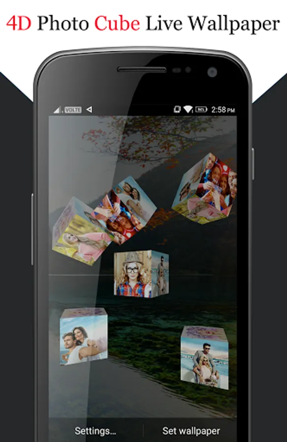 This Live Wallpaper features a rotating 4D photo cube showing pictures and photos from your gallery.