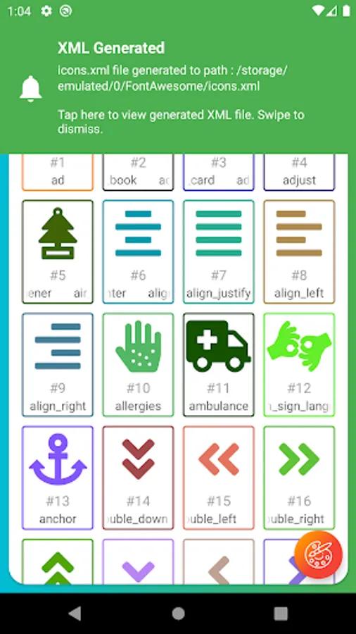 This App is created by a developer for a developer. It shows how Font Awesome is implemented in Android and it can also generate complete icon dictionary (icons.xml). This XML can be copied to any Android project and can be used in conjunction with Font Awesome TTF file. This reduces usage of PNGs or JPEGs which in turn reduces the APK size and as these are based on TTF, it can scale like vector graphics without quality loss.