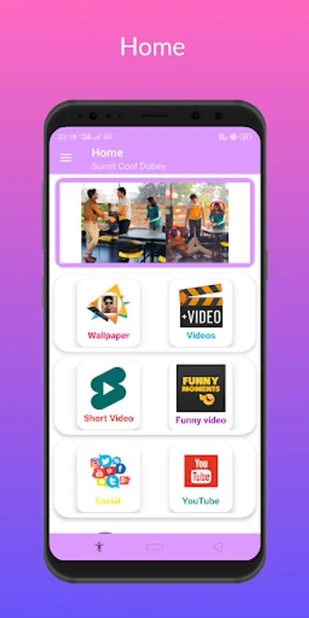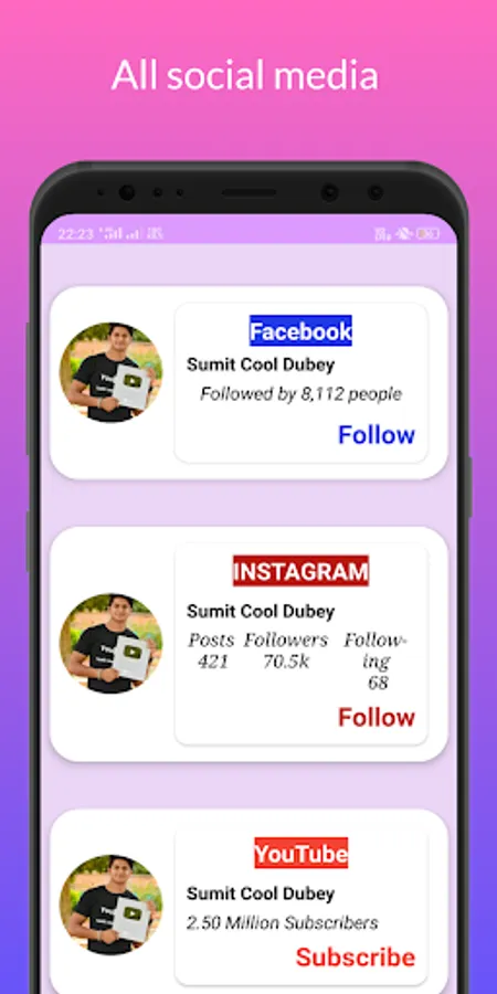 In this app video, photos, shortvideo, funnyvideo, biography,all social platform available