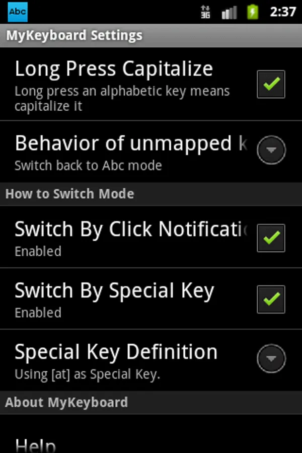 •Long press special key: Switch between "My" mode and "Abc" mode