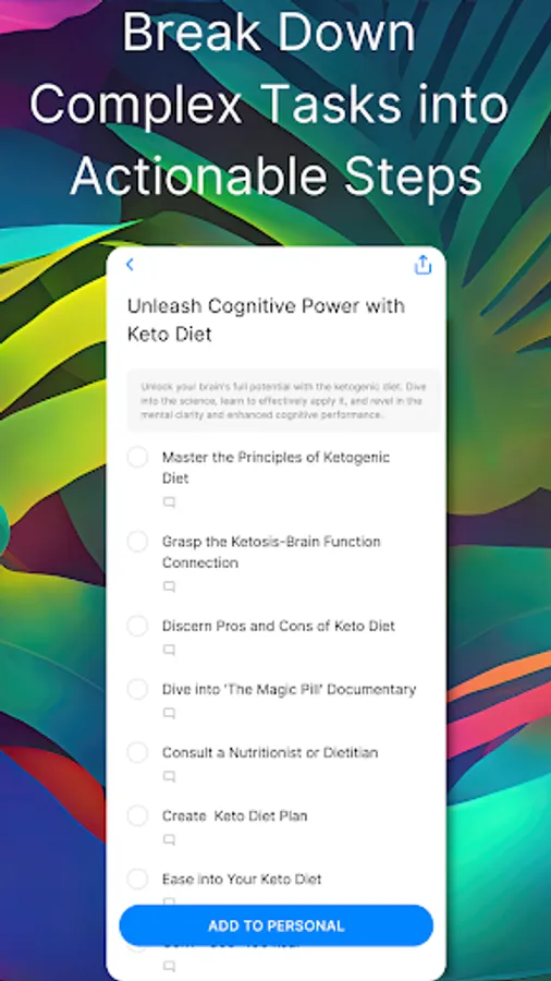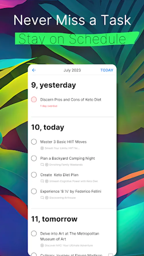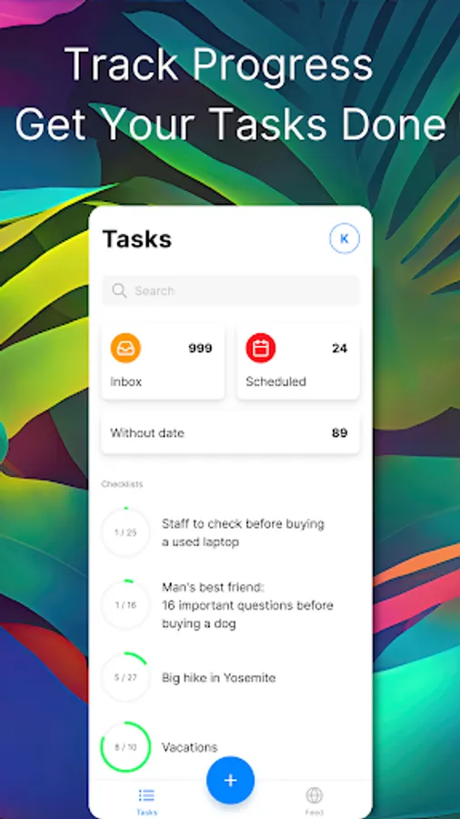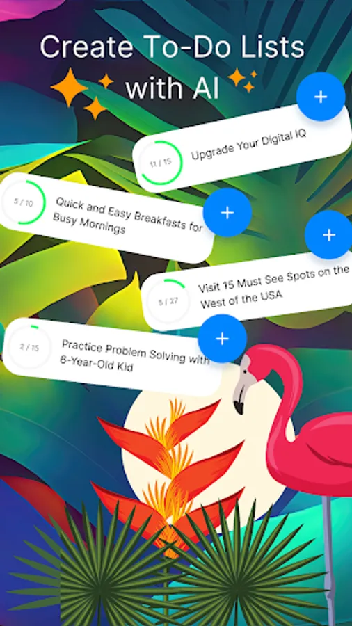 Create task list on any topic using GPT AI, effortlessly add it to your tasks for tracking. Find inspiration in ready-made task lists feed. Miss nothing with to-do planner.