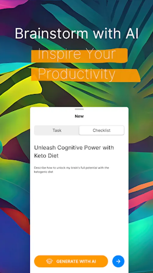 Generate an AI-Crafted Personalized List. Motiv8 uses the advanced OpenAI technology to create a unique task list for you. Just provide a task list name, and let our smart assistant handle the rest. Add more details in description and fine tune your result. Your personalized checklist is just a click away.