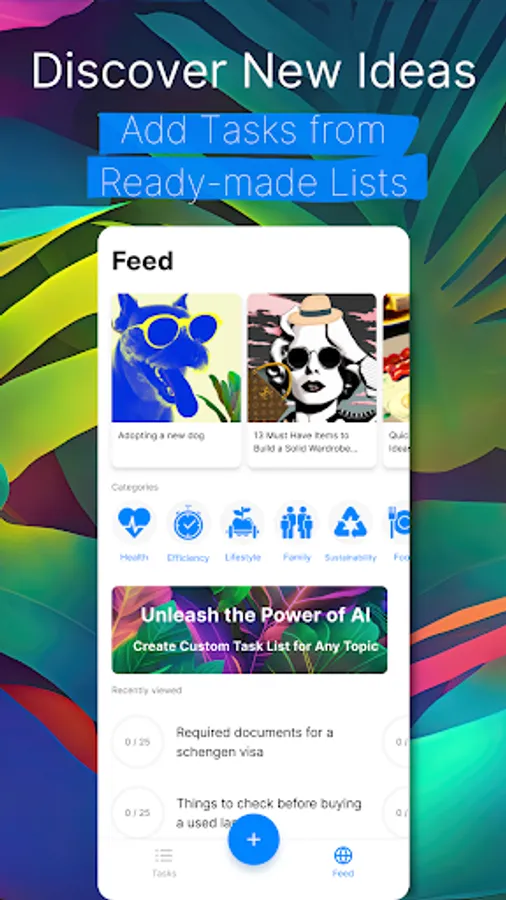Browse through the hivemind of ready-made lists on topics such as Adventures, Efficiency, Family, Food, Health, Lifestyle, and Sustainability. Easily add any list from the feed to your tasks.