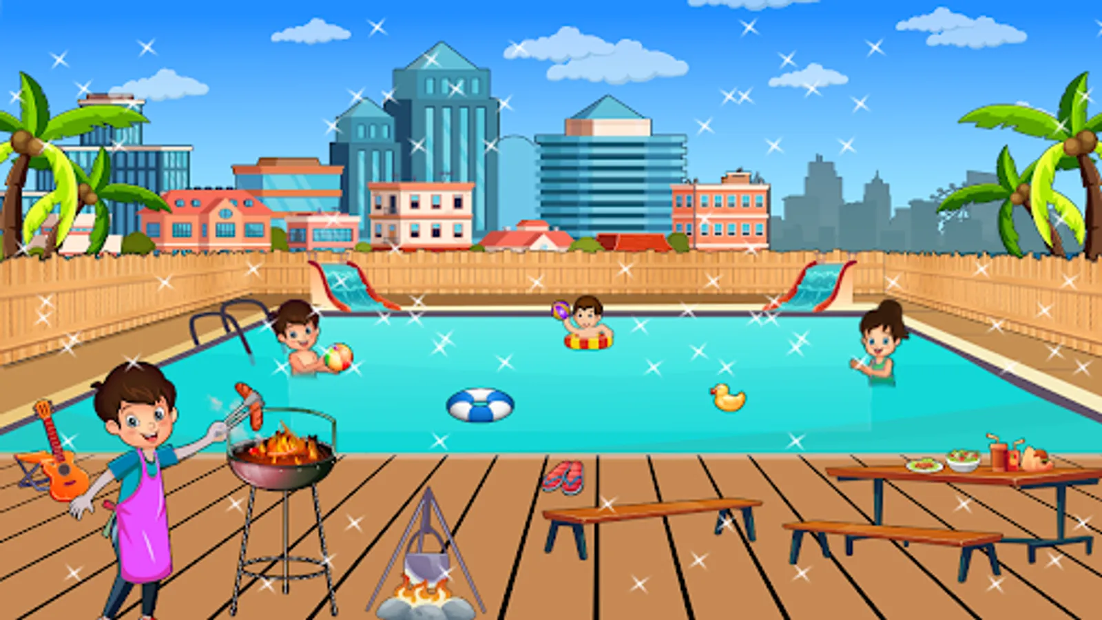 What better way to celebrate summers? Are you ready to have the best pool party in the town? Be a summer girl of all times and throw a big party! Invite all your school friends to an exciting swimming party and defeat the hot summer heat like a star Girl. Also, to keep your girls entertained, we have the best summer pool party game for you, with amazing gameplay. In this game, you can enjoy tons of fun-filled activities at the summer Girl pool party. Go to the supermarket and purchase swimming pool accessories like clothes, goggles, bathing caps, Kickboards, and makeup spa treatment. Wear stylish swimwear suits, clean & decorate the swimming pool, make delicious smoothies with fruits, ice creams, get stylish nail art at the nail polish salon.