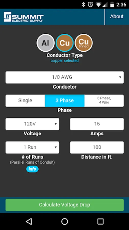 Summit's Voltage Drop Calculator allows you to quickly calculate and share voltage drop for a selected conductor size and type based on the 2014 NEC. This simple and easy-to-use calculator delivers professional results for any size job or project. Simply select your conductor then enter your voltage, amperage, phase, distance, and number of runs to determine the new voltage and percentage dropped. You’ll get instant results for each calculation that includes the formula used as well as detailed technical information.