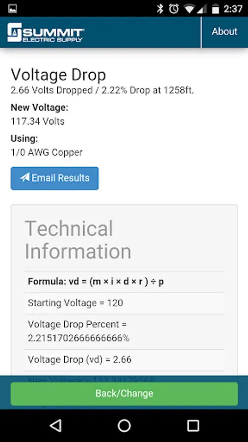 A visual graph also shows the drop in voltage over your entire distance and displays where allowable percentages are so you can make quick adjustments. At the press of a button, you can view and share technical information for every calculation.