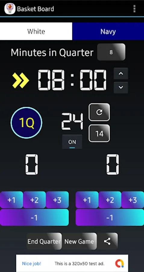 BasketBoard is a revolutionary app that allows you to keep track of your basketball games very easily on your Android device. For starters, it is fully supported in portrait and landscape mode, and the orientation can change even in mid-game without pausing the game. Users will enjoy having dedicated buttons for 1, 2, and 3-point shots as well as -1 for deducting scores. Game clock is synchronized with the shot clock, meaning the shot clock starts automatically when the game starts, and resets to 24 whenever someone scores a basket. Of course, users can turn off the shot clock as they wish in settings. Quarter length can also be changed from 1 to 12 minutes easily. Sounds are an integral part of the app, with different sound bites for scores, end-of-quarter buzzer and shot clock buzzer.