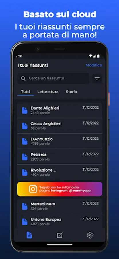 Your account data and summaries are securely saved on our cloud servers in order to allow you to access them from different devices, without losing any data or time!