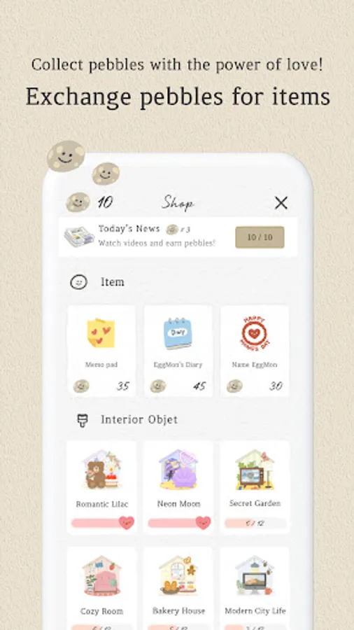 With the pebbles (in-app currency) you collect together within the app, you can buy various items to decorate little EggMon’s room!