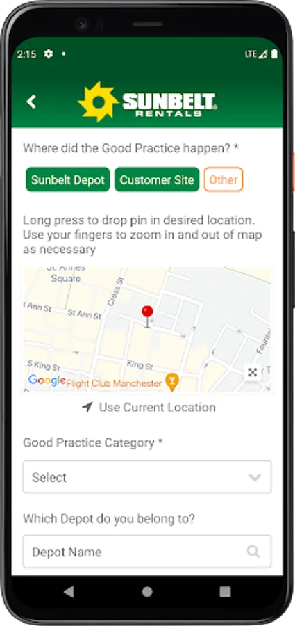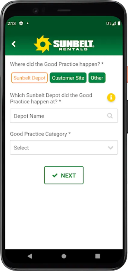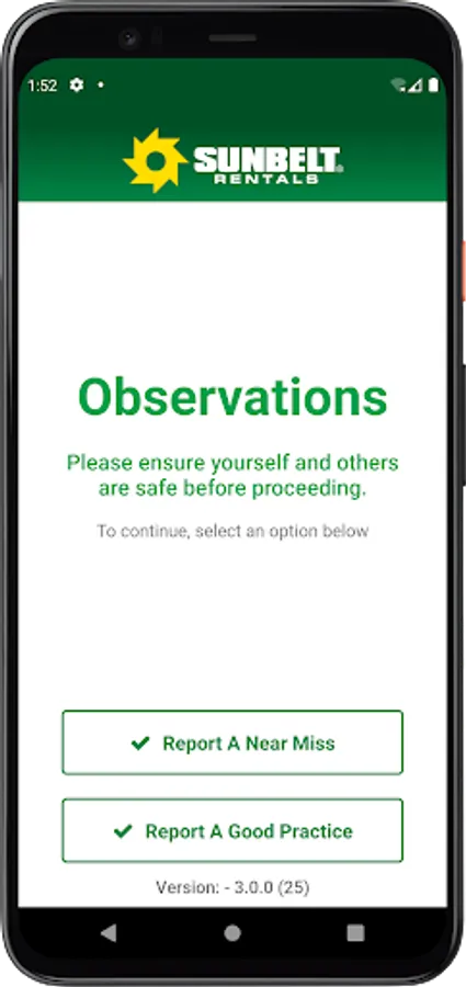 The Sunbelt Rentals Observations app for employees to report a near miss event or a good practice