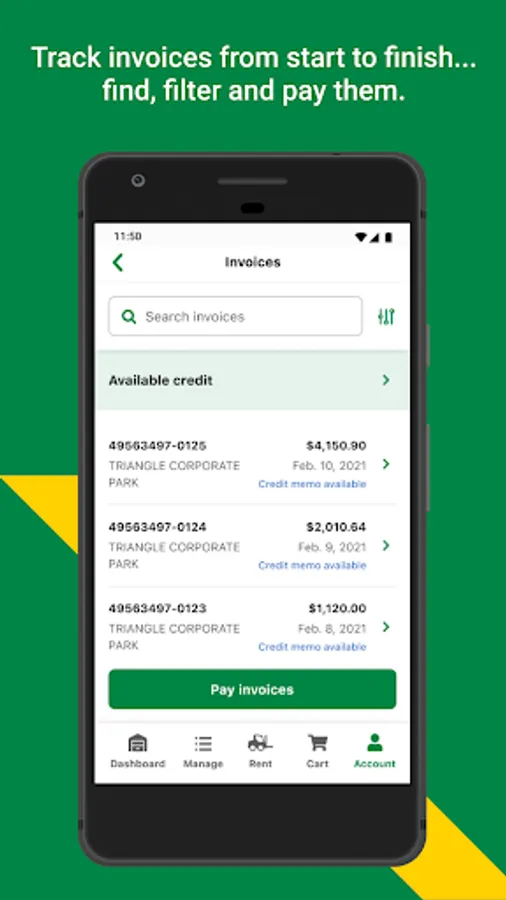 • Pay invoices, take equipment off-rent and get notified of account activity.