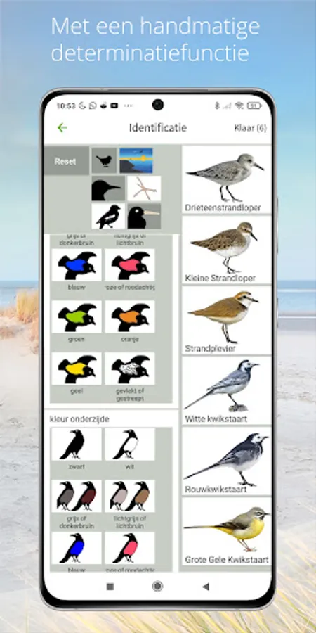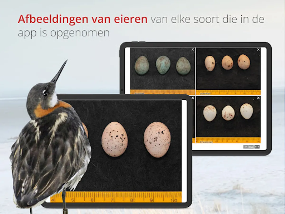 Important in this app are the unique identification cards, which are specially made for the birds that occur in the Netherlands and Belgium. They show the different (sub)species and the different plumage. Each card also contains special features and distinguishing marks that draw attention to possible confusion with other species.
