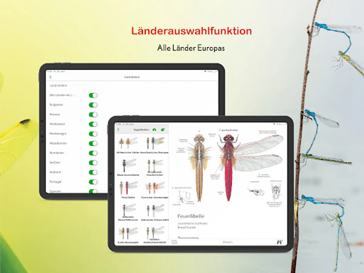 A comprehensive field guide to the dragonflies and damselflies of Britain and Ireland and Europe. Select your country and start identifying dragonflies. This app covers in detail the identification of all 164 species that have been recorded in Europe.