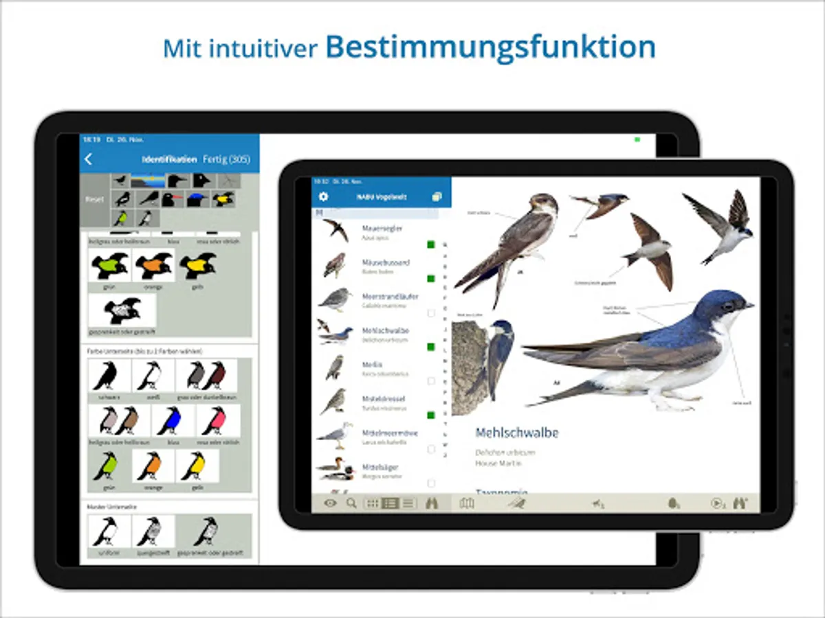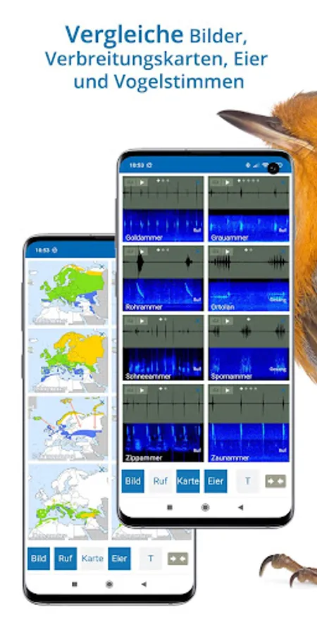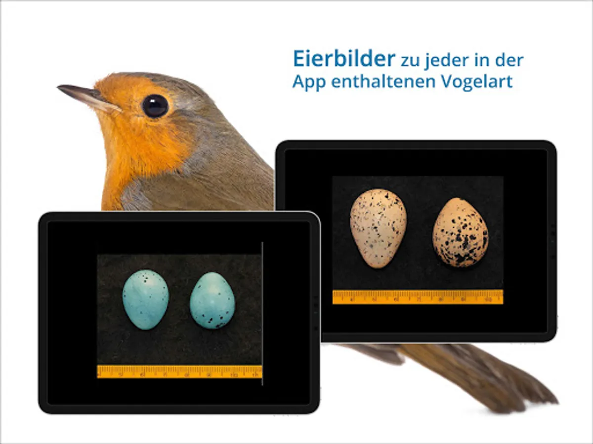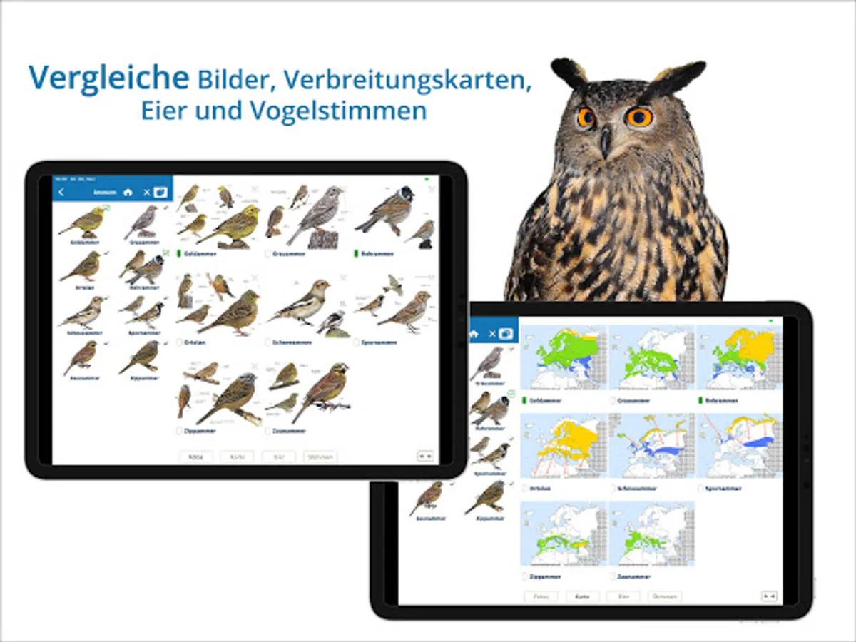 • Compare function for direct comparison of images, distribution maps, eggs and bird calls of up to 8 species on the smartphone + up to 16 species on the tablet