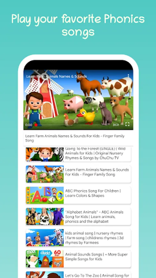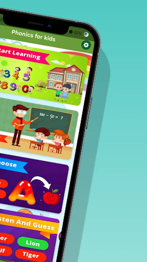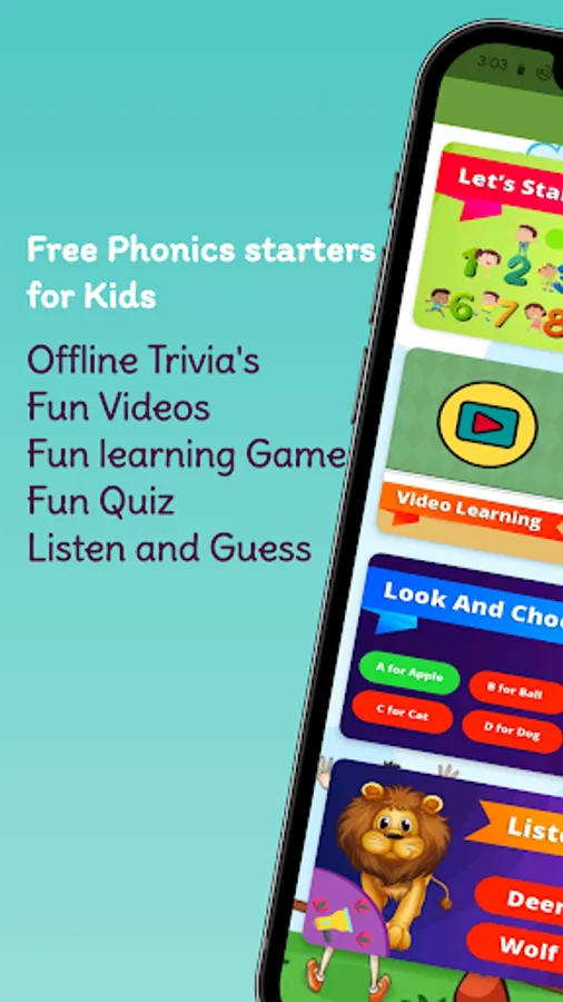 The game includes a variety of unique ways to teach phonics, especially to children in a fun way, such as Videos, Learn, Play, Guess, TRIVIA, Sorting, and Matching.