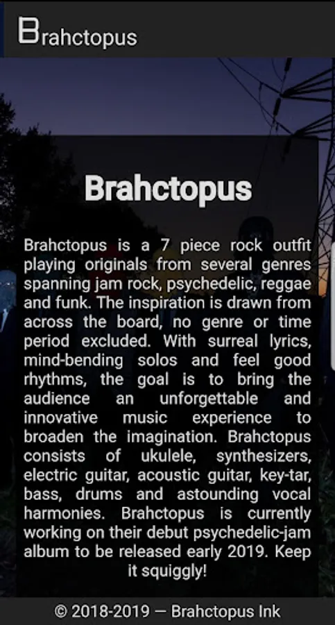 Get all the features of Brahctopus' website, but as an app! Brahctopus is a 7 piece rock outfit playing originals from several genres spanning jam rock, psychedelic, reggae and funk. The inspiration is drawn from across the board, no genre or time period excluded. With surreal lyrics, mind-bending solos and feel good rhythms, the goal is to bring the audience an unforgettable and innovative music experience to broaden the imagination. Brahctopus consists of ukulele, synthesizers, electric guitar, acoustic guitar, key-tar, bass, drums and astounding vocal harmonies. Brahctopus is currently working on their debut psychedelic-jam album to be released early 2019. Keep it squiggly! 🐙