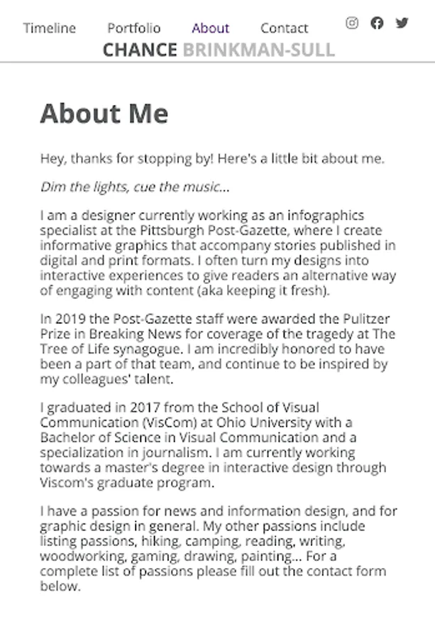 I am a designer currently working as an infographics specialist at the Pittsburgh Post-Gazette, where I create informative graphics that accompany stories published in digital and print formats. I often turn my designs into interactive experiences to give readers an alternative way of engaging with content (aka keeping it fresh).