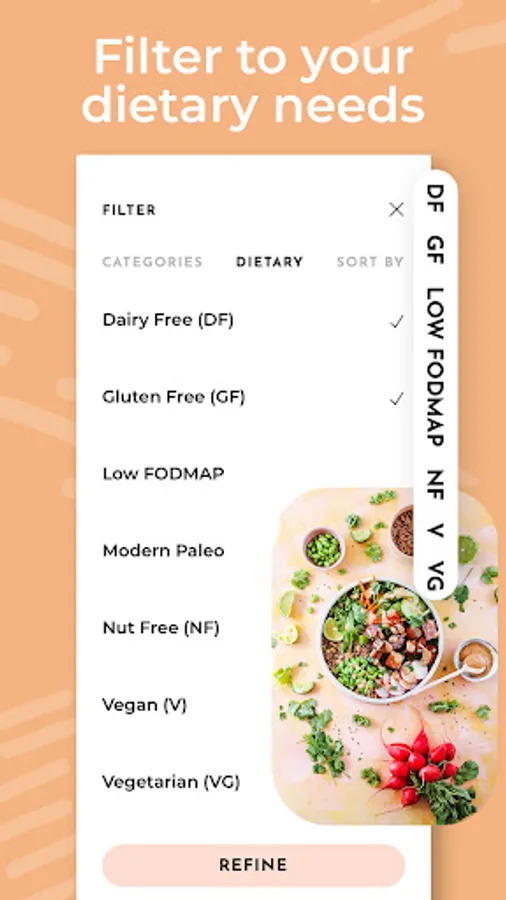 • Filter recipes via GF, DF, V, VG, NF, Low FODMAP and Paleo