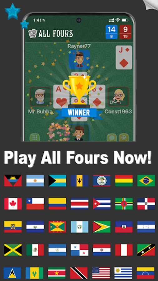 Play Trinidad and Tobago's favorite playing card game now for free with cross platform multiplayer and challenging single player modes. Add friends, create chat rooms, host tournaments, compete globally, customize game rules and have a great time with the best All Fours app available.