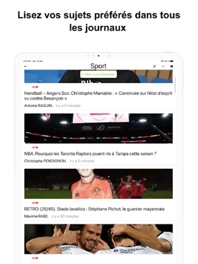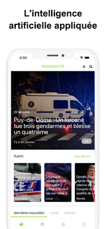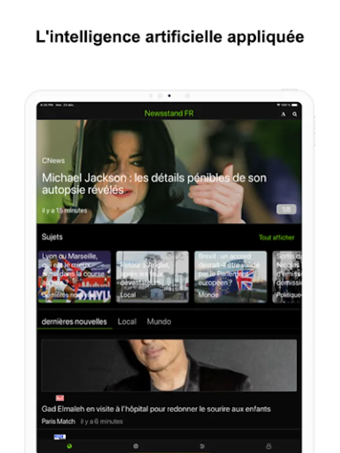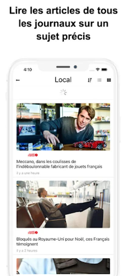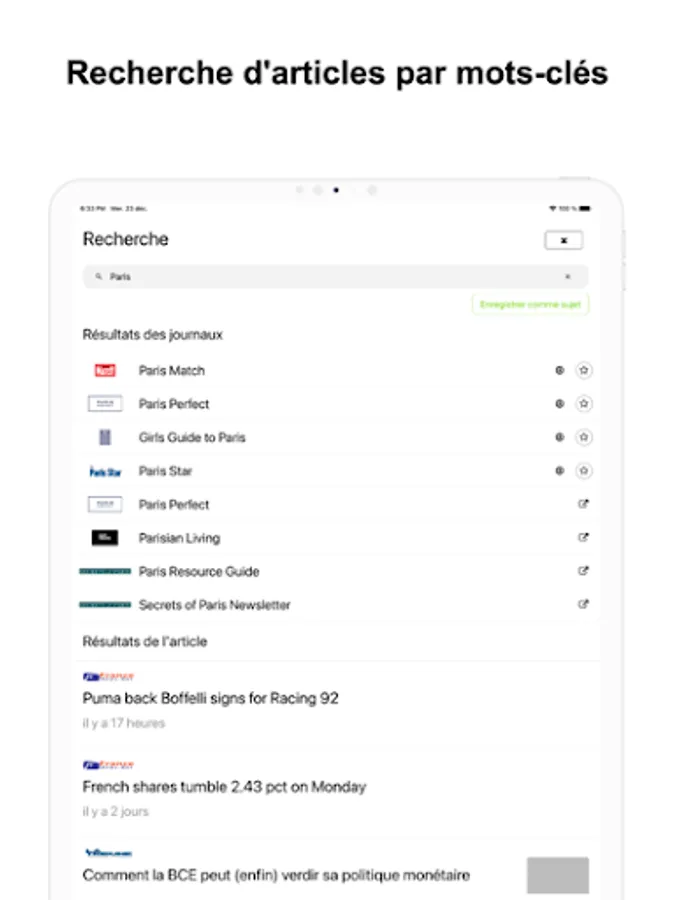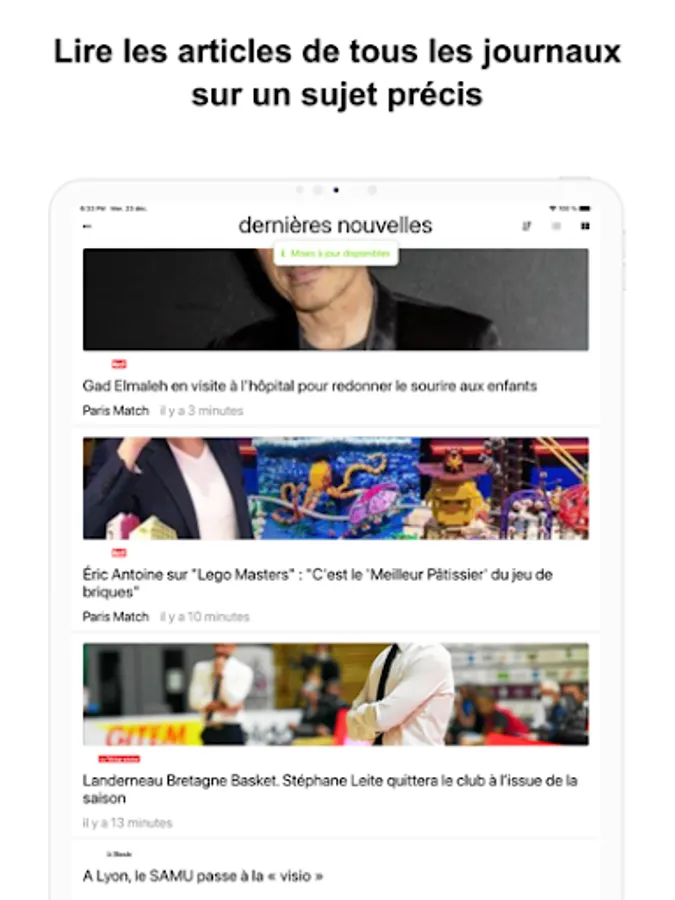 The display of articles according to the topics that interest you allows you to follow the news you like in the main French newspapers. Among the topics covered: news, local news, world, business, politics, society, sports, culture, fashion, cinema and many more.