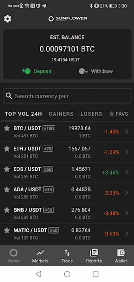 Sunflower Corporation is a deep liquidity ecosystem focused on crypto derivatives, launched in 2022 and based in Saint Vincent and the Grenadines. Sunflower Corporation features a friendly user interface, competitive execution rates, fancy order types, versatile and robust API, and 24/7 support. Sunflower Corporation offers BTC/USDT perpetual futures with up to x100 leverage, as well as most trending instruments (UNI, SUSHI, AAVE, SLP, AXS, DOT, MATIC) with up to x20 leverage.