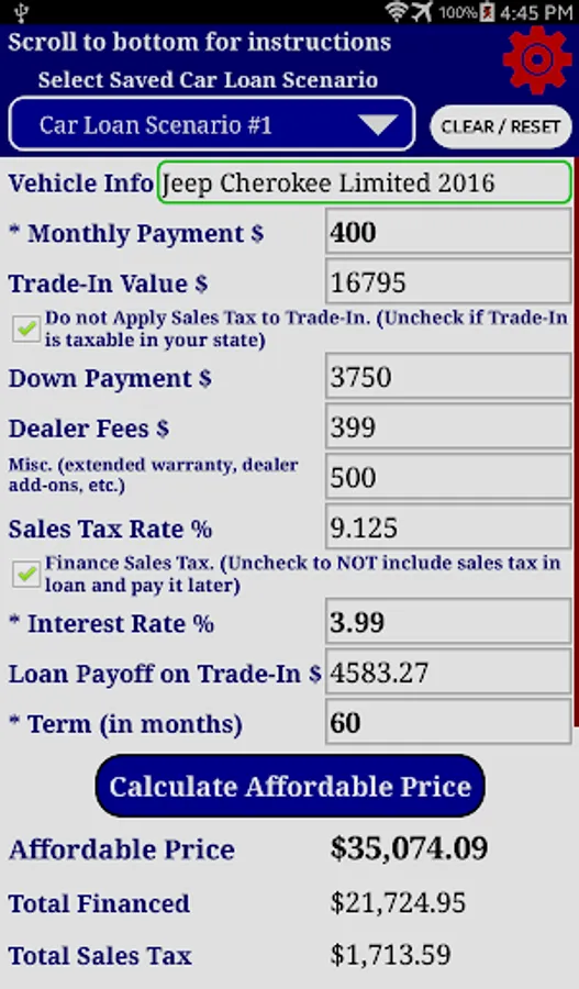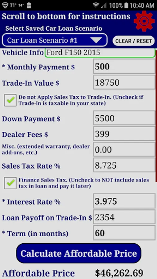 The app then calculates the affordable purchase price of the car based on the information above. It will also display the total amount financed and the total sales tax.