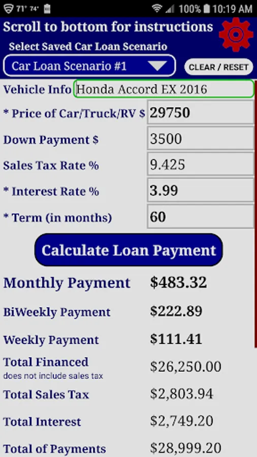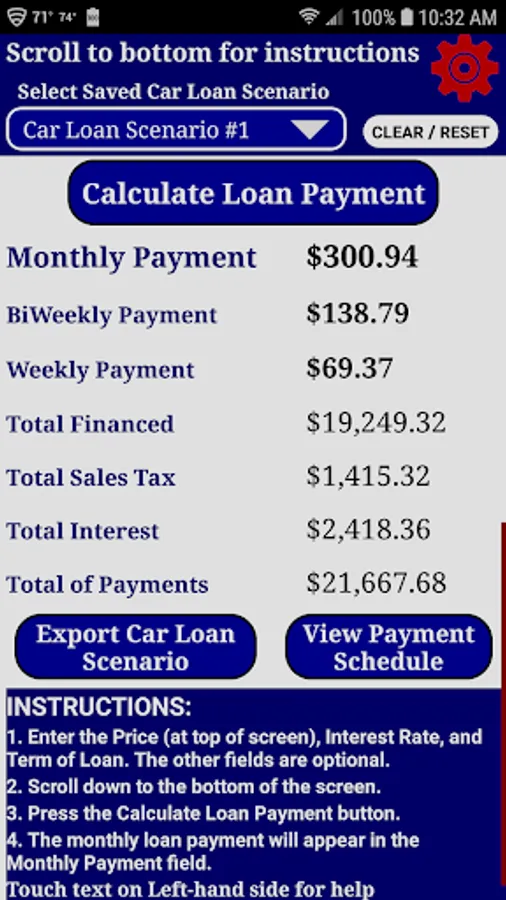 The app then calculates the monthly loan payment of the car based on the information above. It will also display the total amount financed and the total sales tax.