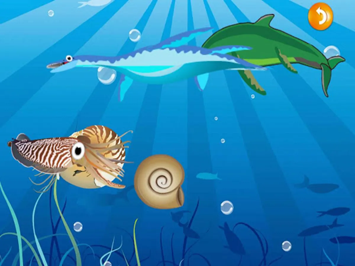 Scene 4 (Seabed): Plesiosaurus, sepia, Nautilidae, Ichthyosaurus, shell