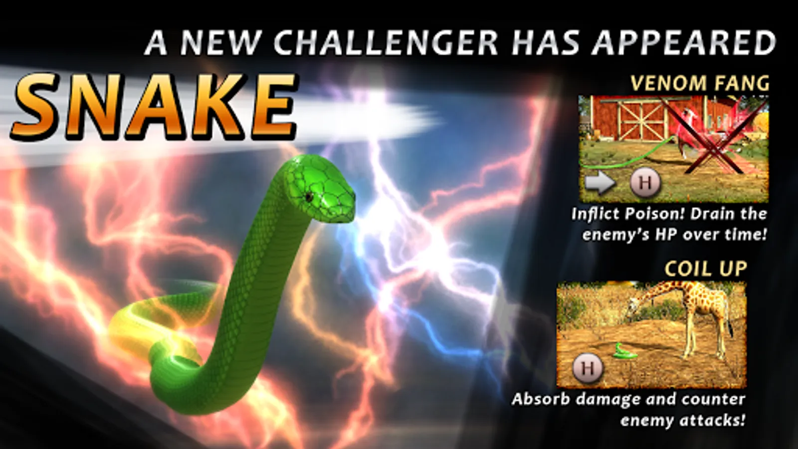 NEW! Snake has joined the roster! Use venomous strikes and speed to defeat your opponents!