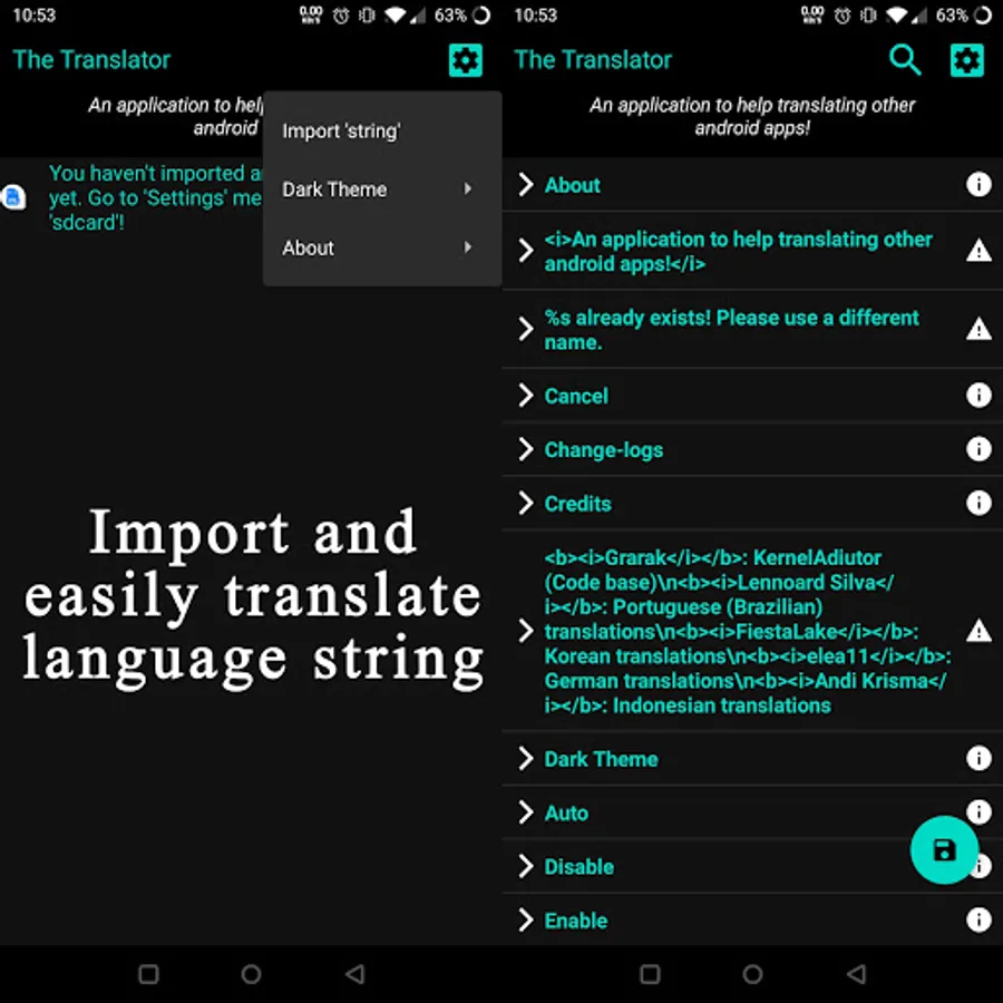 🔸 Import the same from 'sdcard' to the Translator (Settings --> Import 'string').