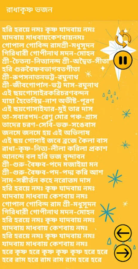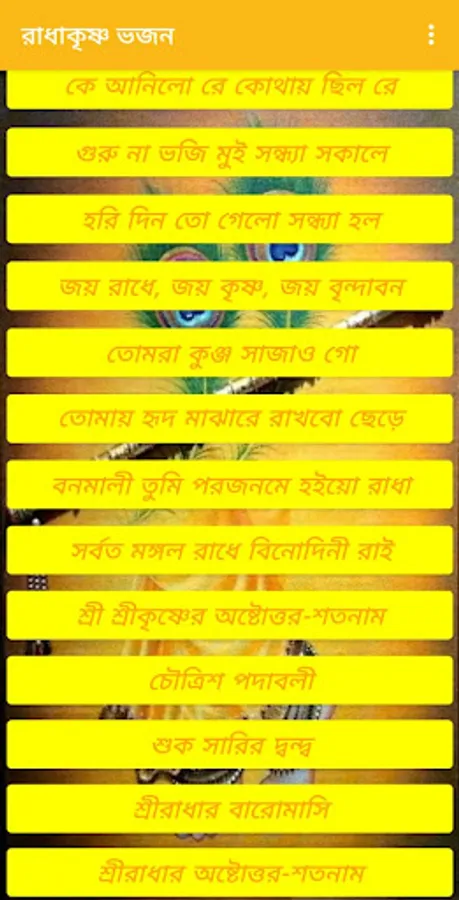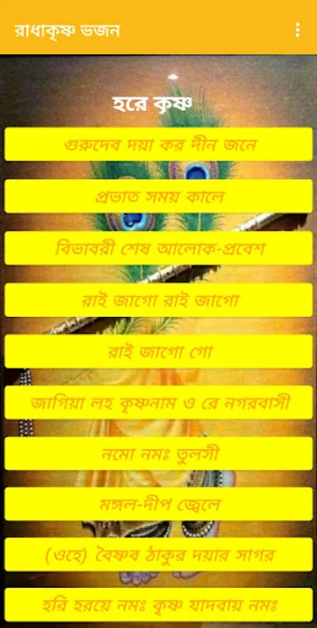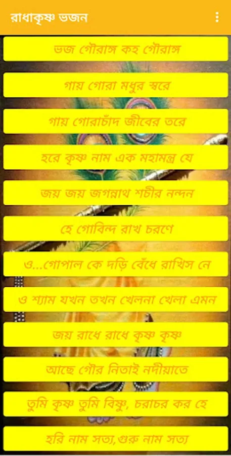Radha Krishna Bhajans (বাংলা ) app included 36 songs like gurudebo doya koro , provat somoy kale, srikrishna sotonam , sriradha sotonam etc.