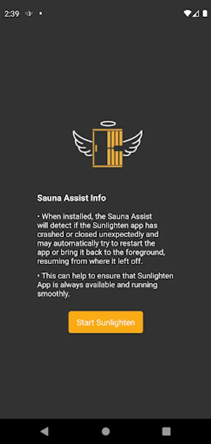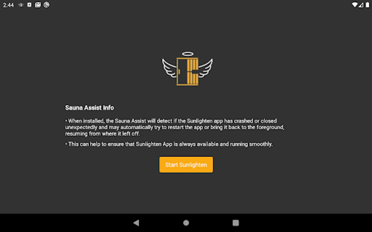 - When installed, the Sauna Assist will detect if the Sunlighten app has crashed or closed unexpectedly and may automatically try to restart the app or bring it back to the foreground, resuming from where it left off.