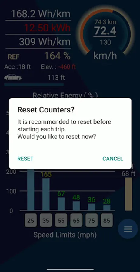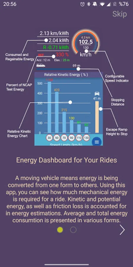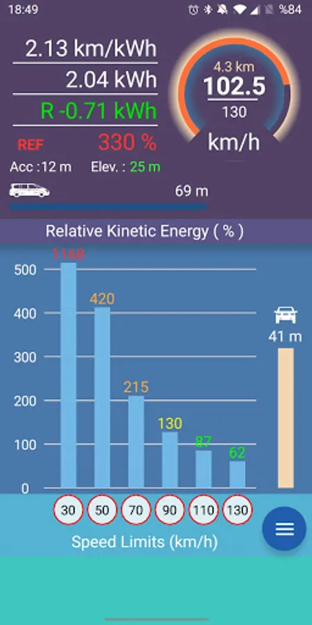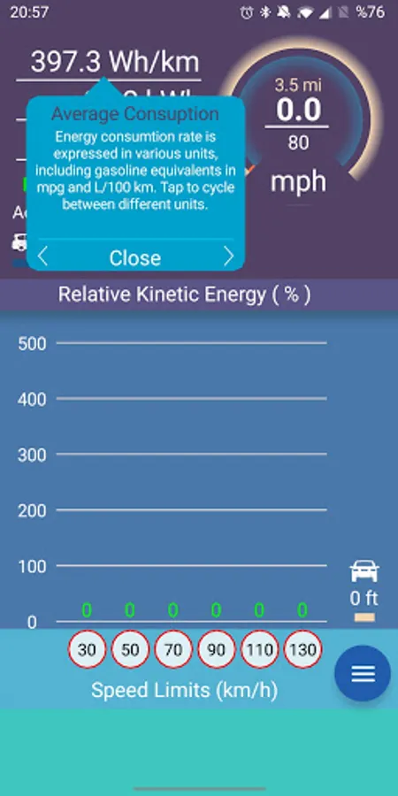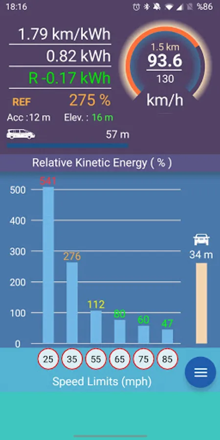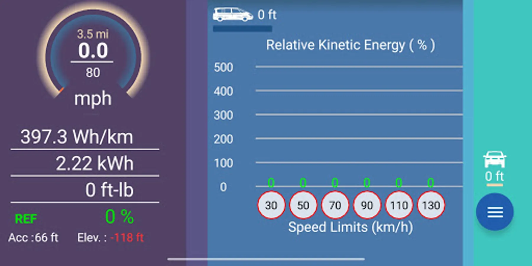 Based on vehicle type and total weight info, the app calculates energy consumption of the vehicle while you ride. Instant kinetic energy and estimated total energy consumption are displayed.