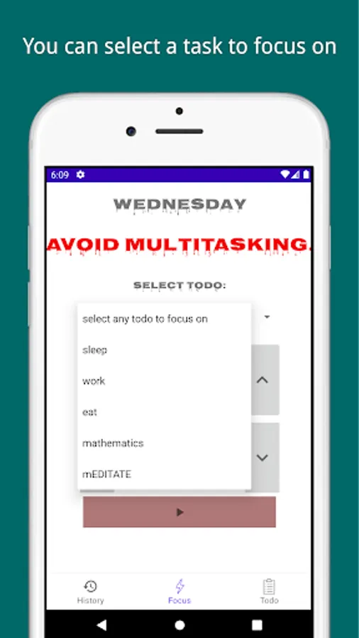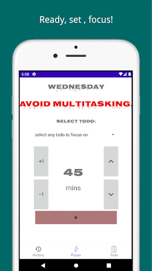 2.Focus tab from where you can start timer to start focusing on.It is where you can also select a task/todo to focus on.