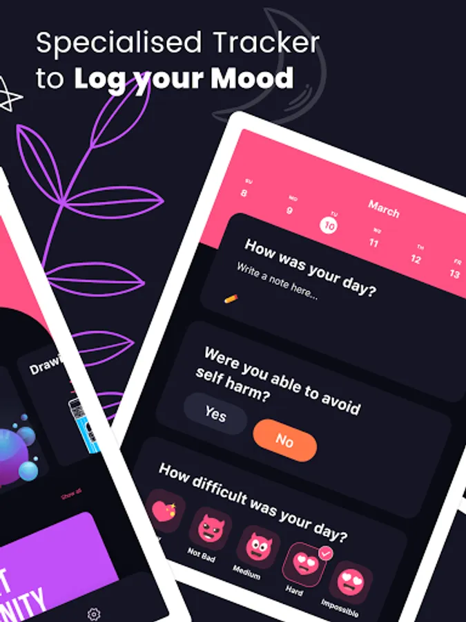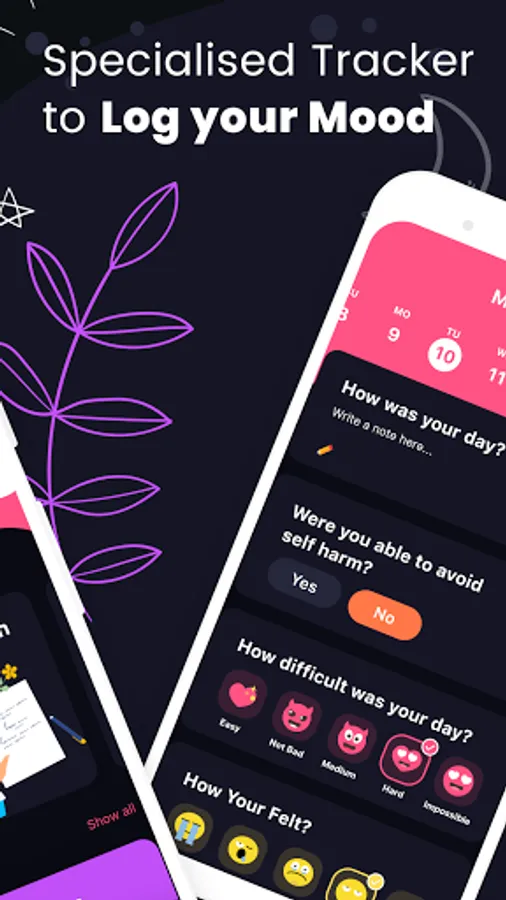 Self tracking your mood swings, stress, daily mood patterns is way easier and motivational for your own health & mental growth. Calm your mind and body by stressing less. Self protect yourself from depression with our Self Harm Tracker.
