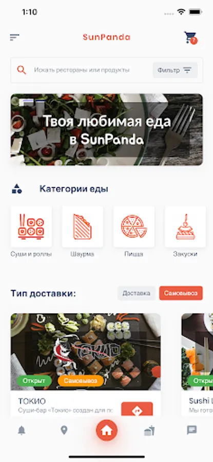The SunPanda Novoshakhtinsk application will help you order dishes from your favorite cafes and restaurants, and quickly arrange delivery to your home, office or pickup.