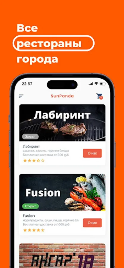 The SunPanda Znamensk application will help you order dishes from your favorite cafes and restaurants, and quickly arrange delivery to your home, office or pickup.